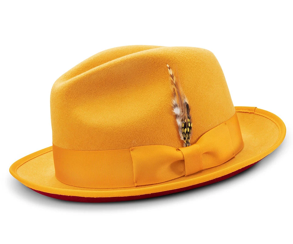 2 ⅜” Brim Wool Felt Dress Hat With Feather Accent Gold With Red Bottom