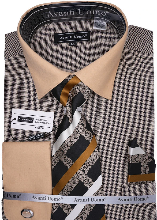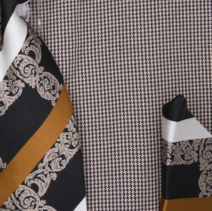 Black Beige Mini-Houndstooth Dress Shirt Set With Tie And Handkerchief