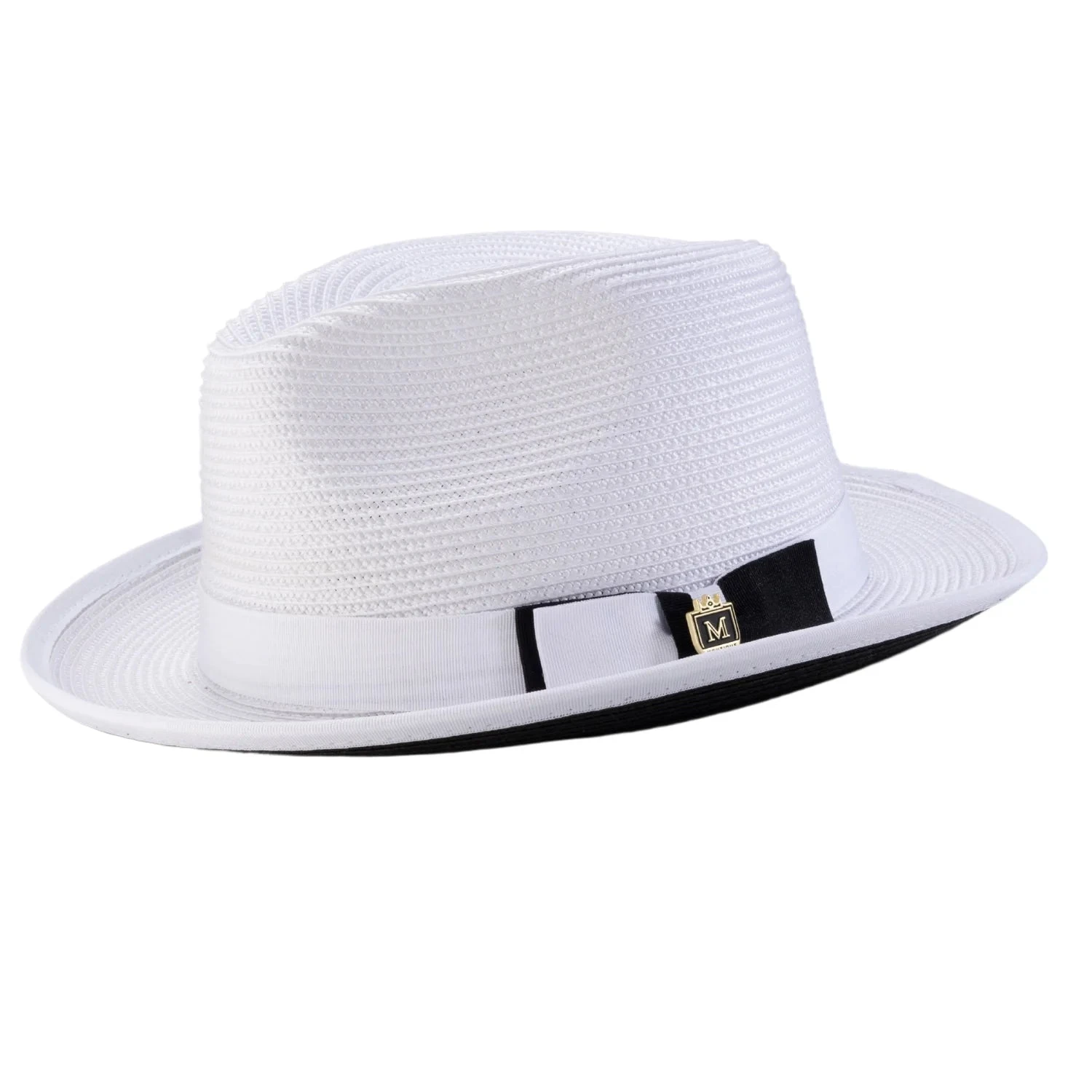- Boasting an eye-catching emerald hue, this fedora hat is constructed from a blend of polyester materials, and further detailed with a grosgrain ribbon along the brim. The hat’s crown is delicately pinched, while the wide brim is approximately 2 1/2″ wide, making a stylish statement.