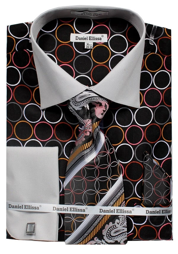 French Cuff Circle Printed Cotton Shirt In Black/Gray With Tie, Cuff Links And Handkerchief