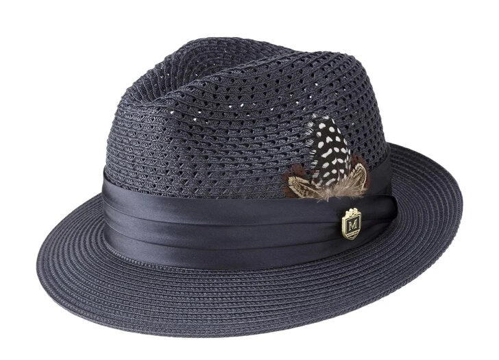 Navy Solid Color Pinch Braided Fedora With Matching Satin Ribbon